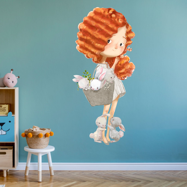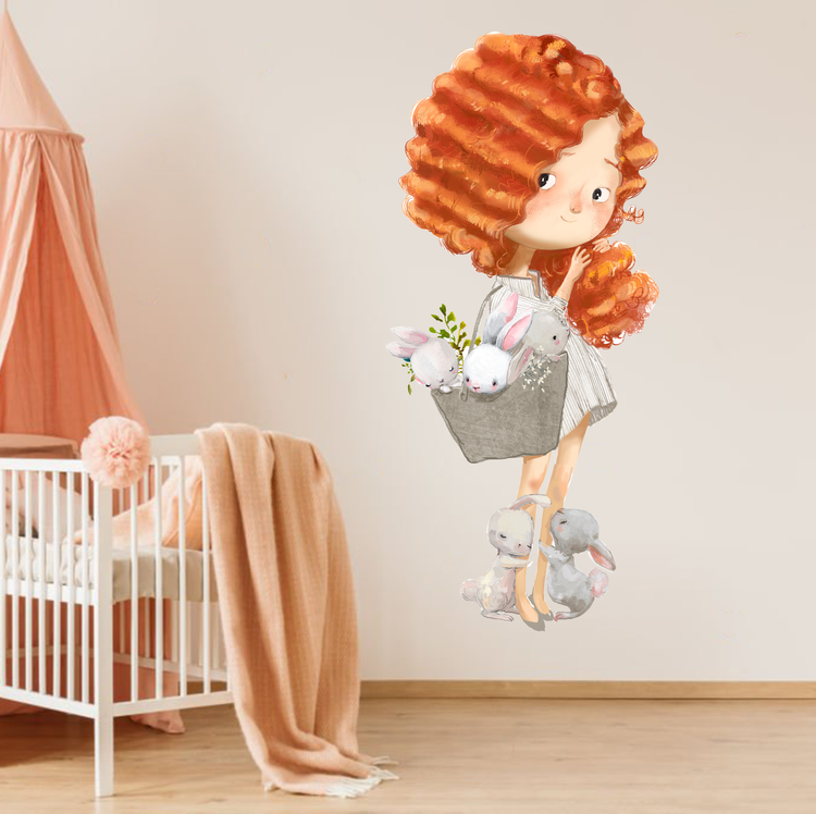 برچسب دیواری اتاق کودک - دختر مو قرمز و خرگوش کوچولوهای ناز - کد W257