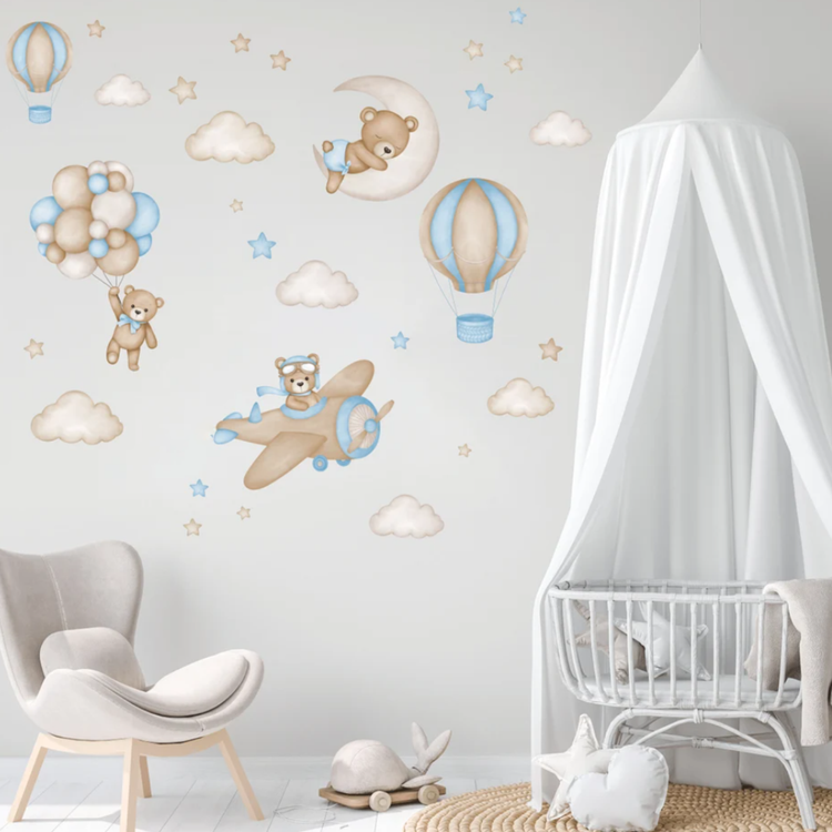 برچسب دیواری اتاق کودک - تدی در آسمان ( تم نسکافه ای ، آبی ) -- کد W295
