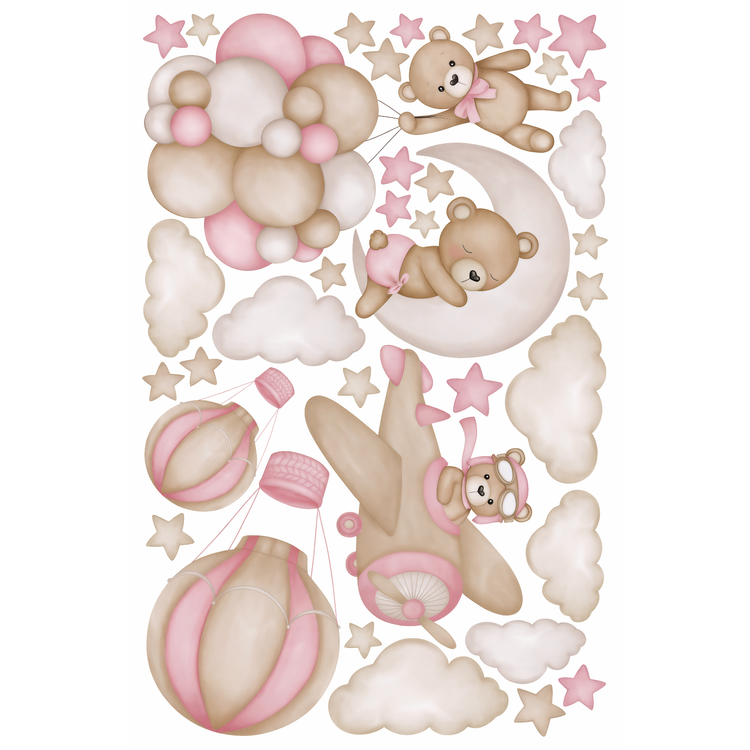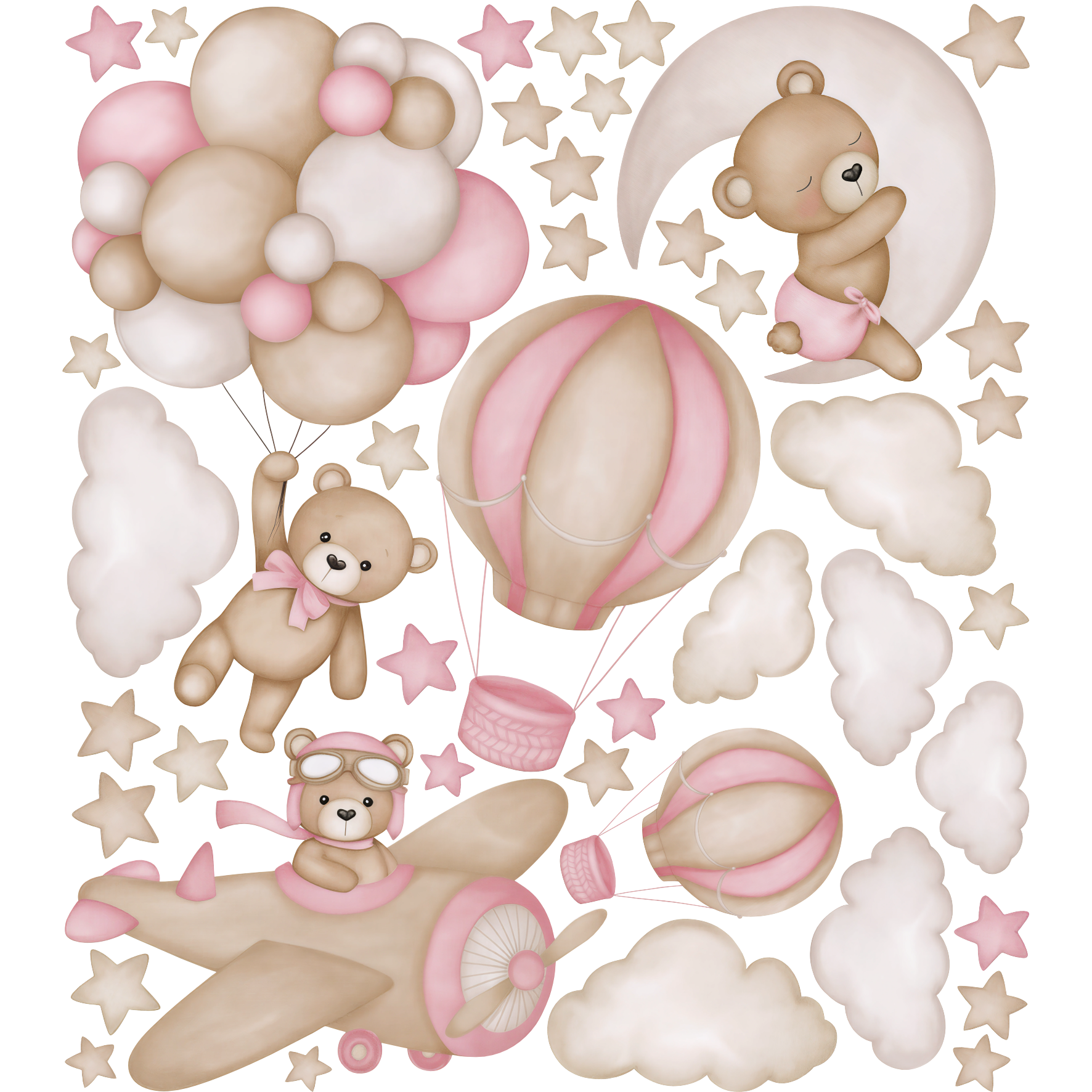 برچسب دیواری اتاق کودک - تدی در آسمان ( تم نسکافه ای ، صورتی ) -- کد W296